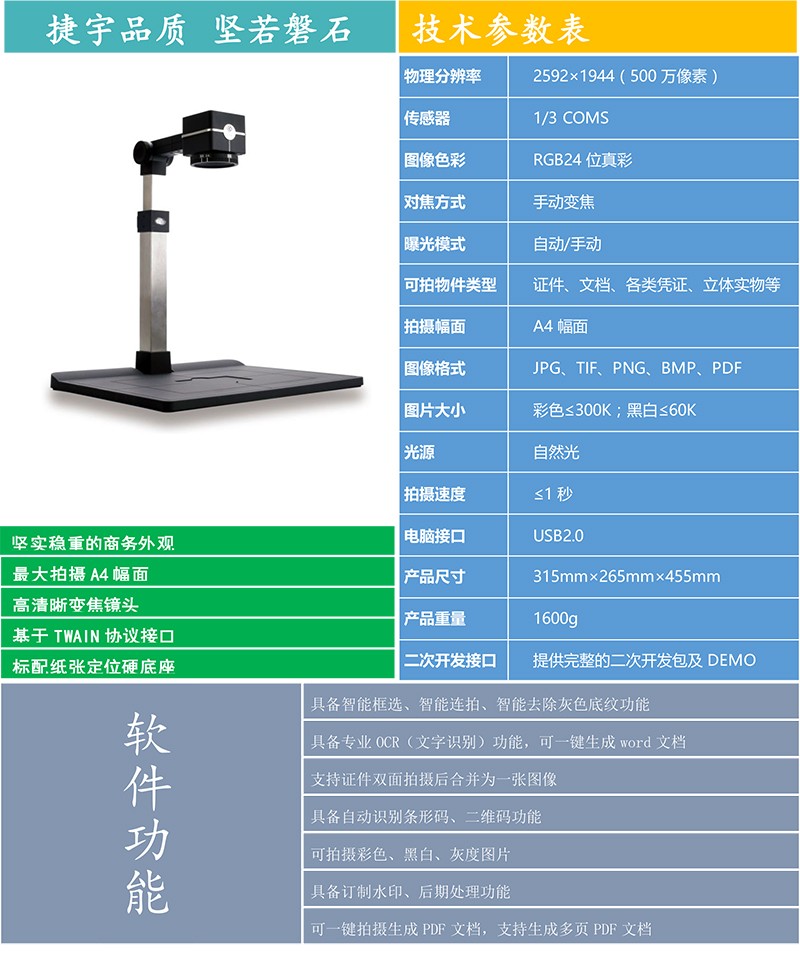 “捷宇”品牌的高拍儀產(chǎn)品可以完全取代傳統(tǒng)平板掃描儀,除了在各項性能指標(biāo)上優(yōu)于傳統(tǒng)掃描儀之外,更具備了體積小、無機(jī)械損耗、不用外接電源等傳統(tǒng)掃描儀無法實現(xiàn)的優(yōu)點!