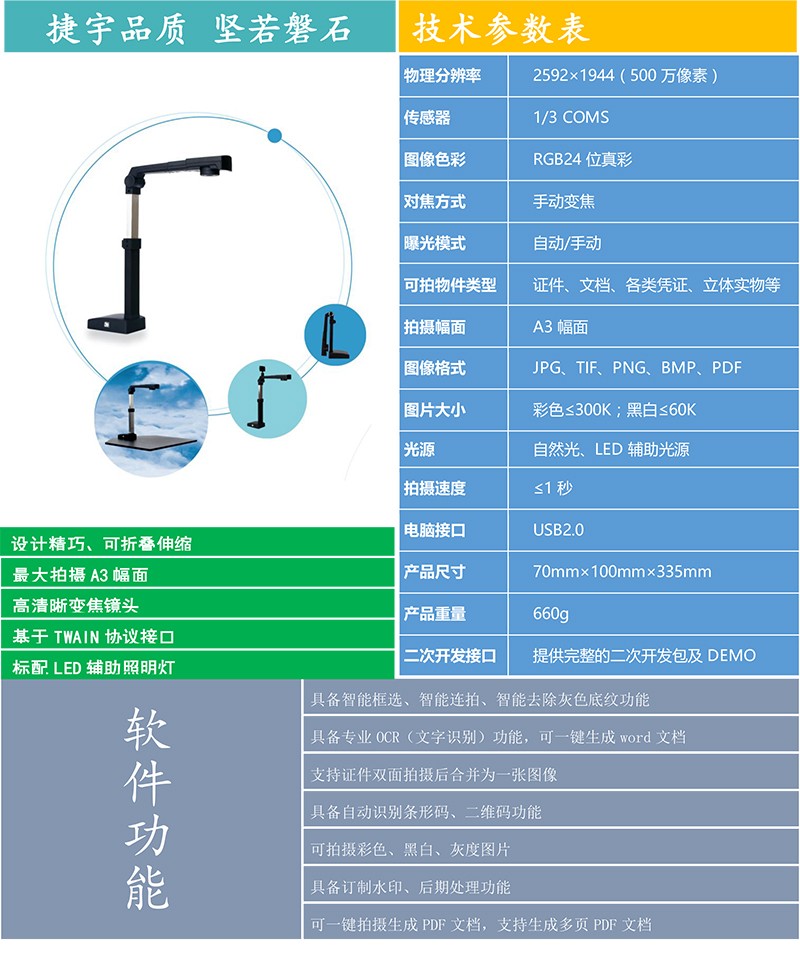 “捷易拍”品牌的高拍儀產(chǎn)品可以完全取代傳統(tǒng)平板掃描儀,除了在各項性能指標(biāo)上優(yōu)于傳統(tǒng)掃描儀之外,更具備了體積小、無機(jī)械損耗、不用外接電源等傳統(tǒng)掃描儀無法實現(xiàn)的優(yōu)點!