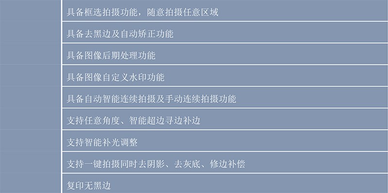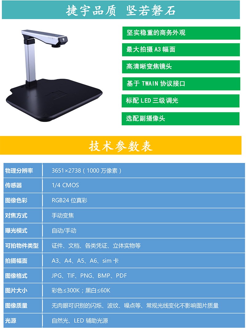 捷宇高拍儀產(chǎn)品可以完全取代傳統(tǒng)平板掃描儀,除了在各項(xiàng)性能指標(biāo)上優(yōu)于傳統(tǒng)掃描儀之外,更具備了體積小、無機(jī)械損耗、不用外接電源等傳統(tǒng)掃描儀無法實(shí)現(xiàn)的優(yōu)點(diǎn)!